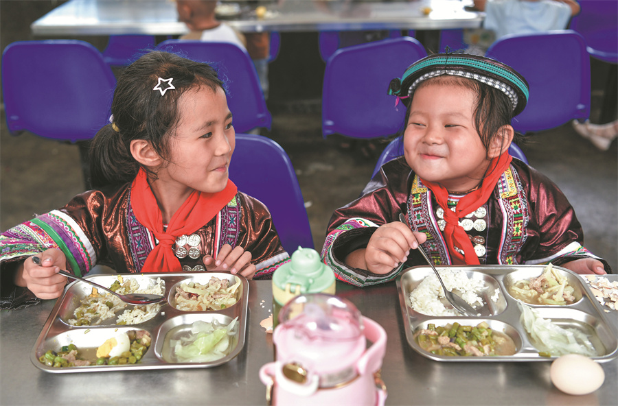 Two students eat their lunch at the school's canteen on Sept 6. (YANG WENBIN/XINHUA)