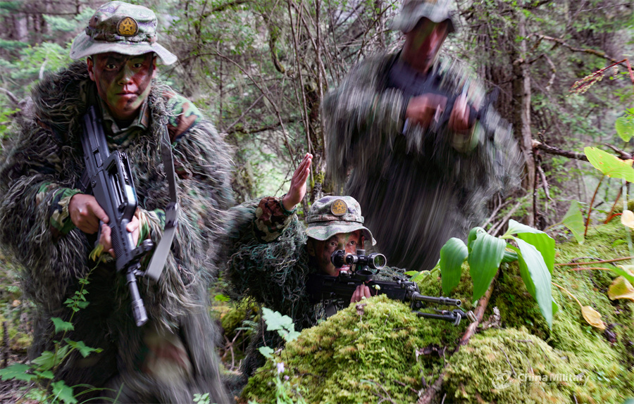 A soldier assigned to a regiment under the Chinese PLA Xizang Military Command observes surrounding environment during a tactical training exercise in the woods on August 27, 2024. (eng.chinamil.com.cn/Photo by Fu Shaoyin)