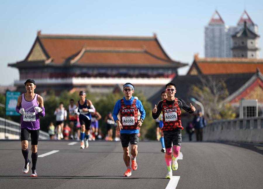 Participants run during the 2024 Tianjin Marathon, Oct. 20, 2024. (Xinhua/Sun Fanyue)