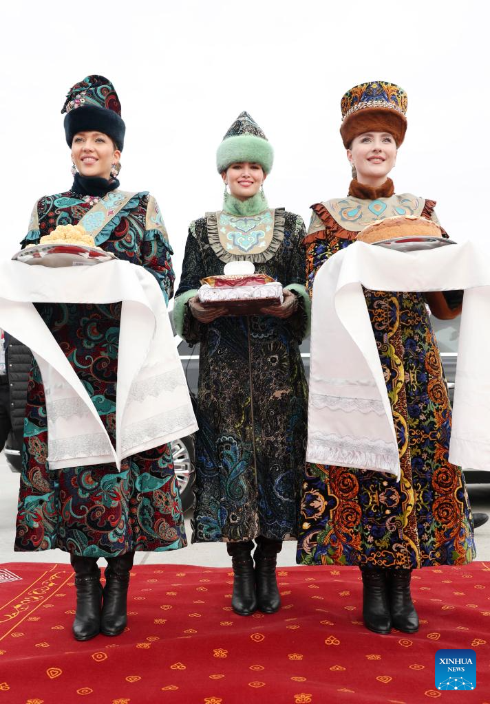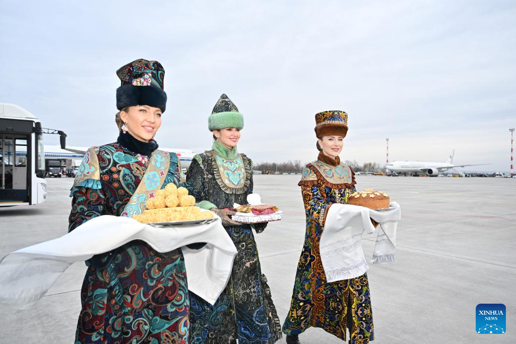 Russian youths dressed in national costumes welcome Chinese President Xi Jinping with traditional courtesy in Kazan, Russia, Oct. 22, 2024. Xi arrived in Kazan on Tuesday for the 16th BRICS Summit at the invitation of President of the Russian Federation Vladimir Putin. (Xinhua/Yue Yuewei)
