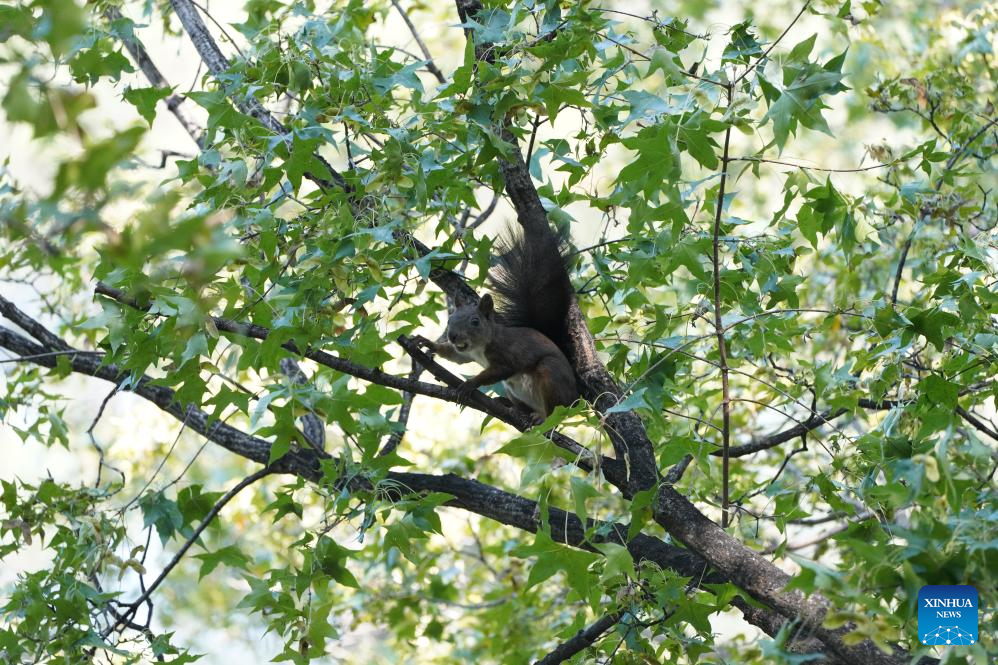 A squirrel is pictured in a tree at the Summer Palace in Beijing, capital of China, on Oct. 24, 2024. The Summer Palace is China's largest imperial park and among the most noted classical gardens in the world. In 1998, it was listed as one of the World Heritage Sites by UNESCO. (Xinhua/Yin Dongxun)