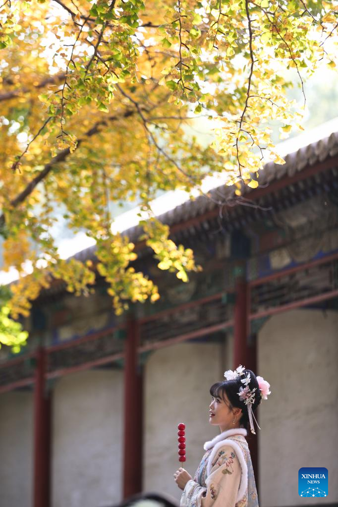 A tourist enjoys the autumn scenery at the Summer Palace in Beijing, capital of China, on Oct. 24, 2024. The Summer Palace is China's largest imperial park and among the most noted classical gardens in the world. In 1998, it was listed as one of the World Heritage Sites by UNESCO. (Xinhua/Xing Guangli)
