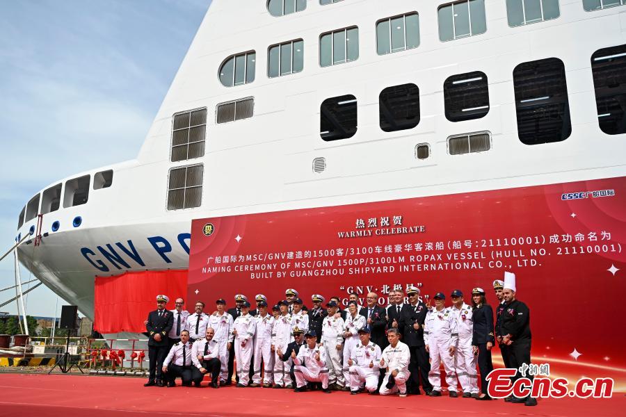 Crew members pose for a group photo during a delivery ceremony of China's first homegrown Ro-Pax ferry - GNV Polaris at Nansha port in Guangzhou, south China's Guangdong Province, Oct. 24, 2024. (Photo: China News Service/Chen Jimin)