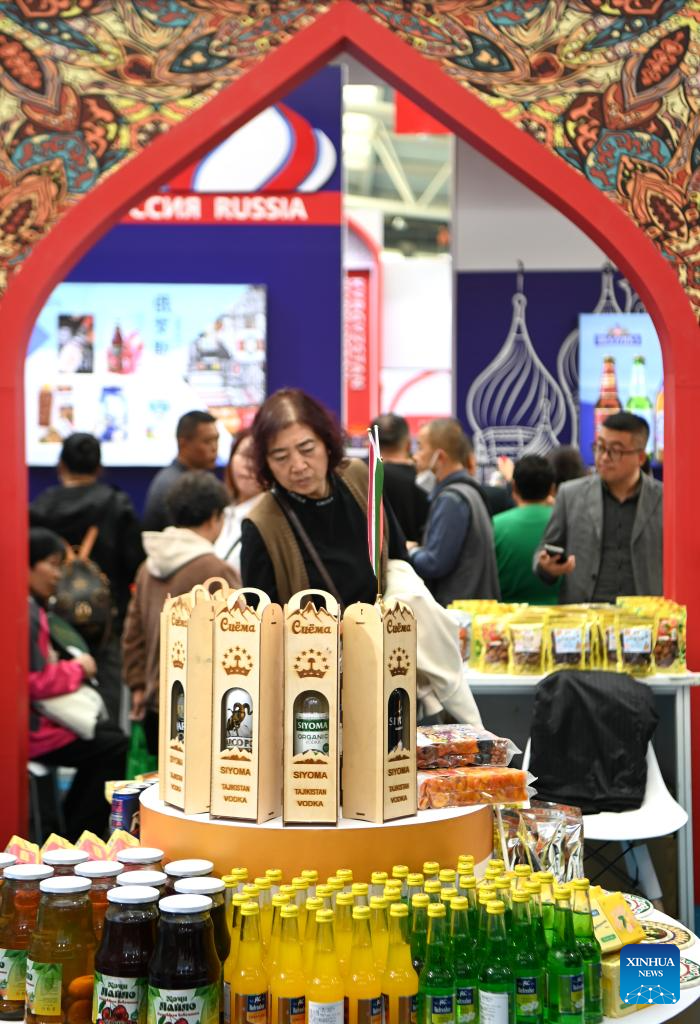 People visit an exhibition booth of agricultural products from Tajikistan at the 31st China Yangling Agricultural Hi-tech Fair in Yangling, northwest China's Shaanxi Province, Oct. 25, 2024. Featuring innovations in agricultural high-tech achievements, the 31st China Yangling Agricultural Hi-tech Fair kicked off here on Friday. The fair will last until Oct. 29. (Xinhua/Zou Jingyi)