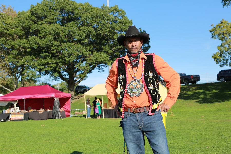 Wayahsti Richardson poses for a photo during annual celebrations on the occasion of Indigenous People's Day on Randalls Island of New York City, the United States, Oct. 11, 2021. (Xinhua/Liu Yanan)
