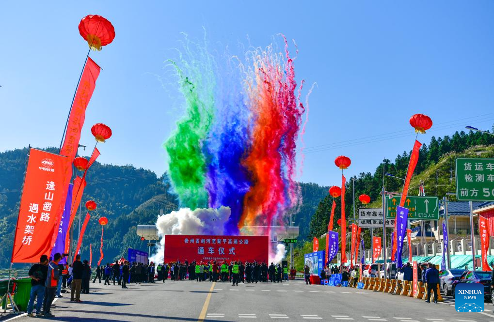 A ceremony marking the operation of Jianhe-Liping expressway is held in Jianhe, southwest China's Guizhou Province, Oct. 25, 2024. The Jianhe-Liping expressway was opened to traffic on Friday, shortening the travel time between Jianhe County and Liping County of Guizhou Province to about one hour. The main line of this expressway stretches 74.754 kilometers. (Xinhua/Yang Wenbin)
