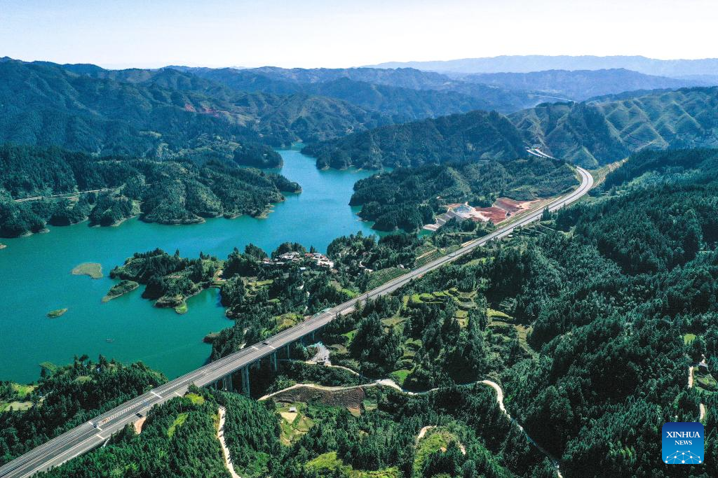 An aerial drone photo taken on Oct. 25, 2024 shows a section of the Jianhe-Liping expressway in southwest China's Guizhou Province. The Jianhe-Liping expressway was opened to traffic on Friday, shortening the travel time between Jianhe County and Liping County of Guizhou Province to about one hour. The main line of this expressway stretches 74.754 kilometers. (Xinhua/Yang Wenbin)