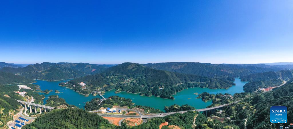 An aerial panoramic drone photo taken on Oct. 25, 2024 shows a section of the Jianhe-Liping expressway in southwest China's Guizhou Province. The Jianhe-Liping expressway was opened to traffic on Friday, shortening the travel time between Jianhe County and Liping County of Guizhou Province to about one hour. The main line of this expressway stretches 74.754 kilometers. (Xinhua/Yang Wenbin)