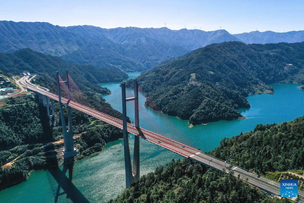An aerial drone photo taken on Oct. 25, 2024 shows Nanmengxi bridge of the Jianhe-Liping expressway in southwest China's Guizhou Province. The Jianhe-Liping expressway was opened to traffic on Friday, shortening the travel time between Jianhe County and Liping County of Guizhou Province to about one hour. The main line of this expressway stretches 74.754 kilometers. (Xinhua/Yang Wenbin)