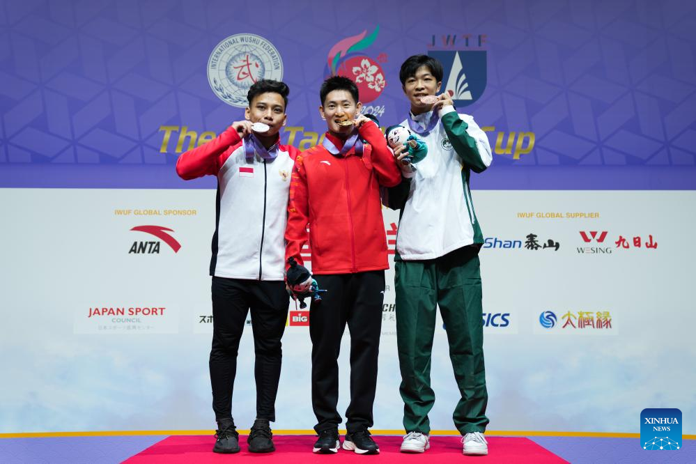 Zhang Qingchun (C) of China, Muhammad Daffa Golden Boy (L) of Indonesia and Chin Ka Hou of China's Macao pose for photos during the awarding ceremony of the Men's Qiangshu competition of the 3rd Taolu World Cup held in Yokohama, Japan, on Oct. 26, 2024. (Xinhua/Zhang Xiaoyu)