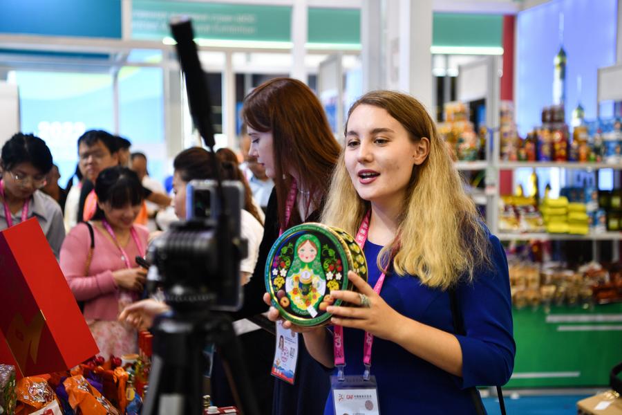 A Russian exhibitor promotes products through live-streaming during the 30th China Yangling Agricultural Hi-tech Fair in Yangling, northwest China's Shaanxi Province, Sept. 19, 2023. (Xinhua/Zhang Bowen)