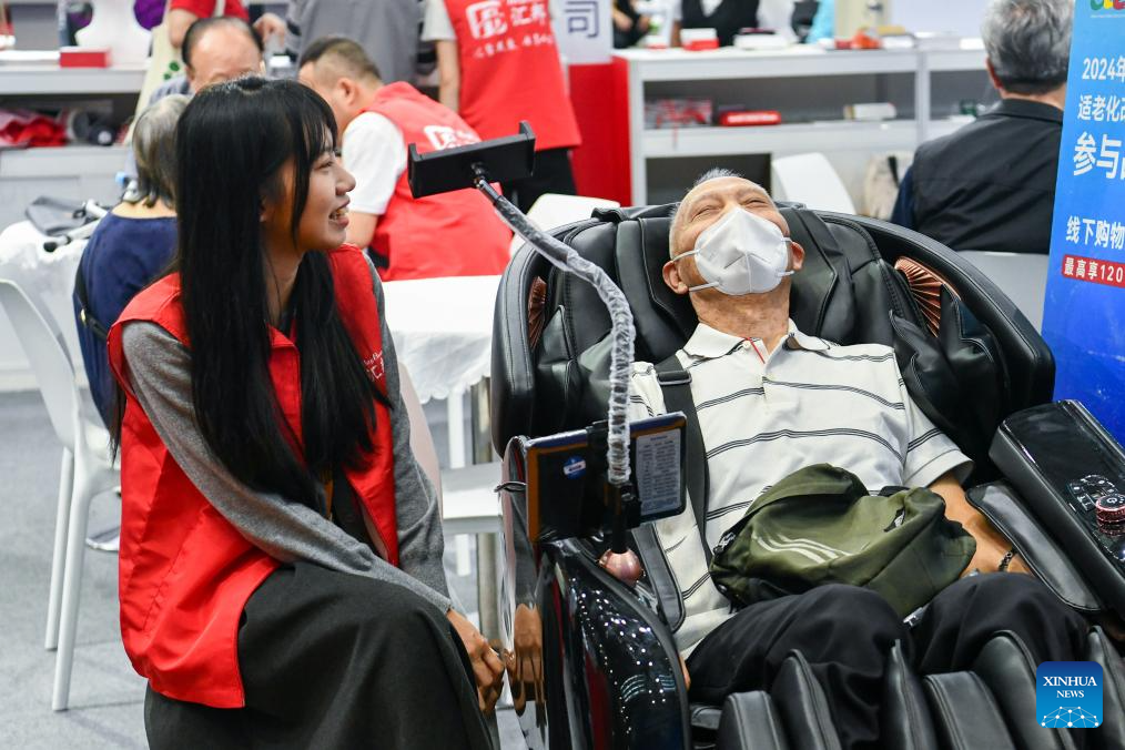 A senior man tries out a massage armchair at the 2024 Shenzhen International Intelligent Elderly Care Industry Expo in Shenzhen, south China's Guangdong Province, Oct. 27, 2024. A total of 203 exhibitors from home and abroad have brought more than 1,000 products and technologies for elderly care to the expo, which was held from Oct. 25 to 27 in Shenzhen. (Xinhua/Liang Xu)