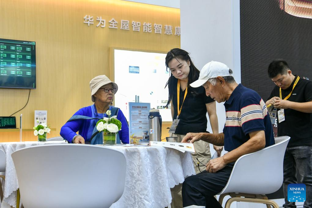 Senior citizens visit the 2024 Shenzhen International Intelligent Elderly Care Industry Expo in Shenzhen, south China's Guangdong Province, Oct. 27, 2024. A total of 203 exhibitors from home and abroad have brought more than 1,000 products and technologies for elderly care to the expo, which was held from Oct. 25 to 27 in Shenzhen. (Xinhua/Liang Xu)