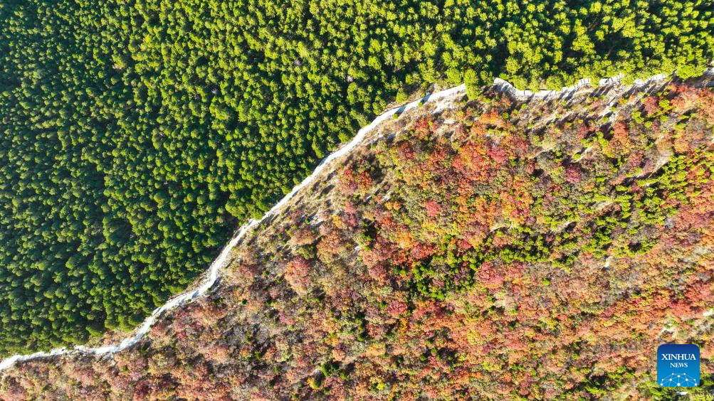 An aerial drone photo taken on Oct. 28, 2024 shows the autumn scenery of a park at Wenxian County in Jiaozuo City, central China's Henan Province. (Photo by Xu Hongxing/Xinhua)