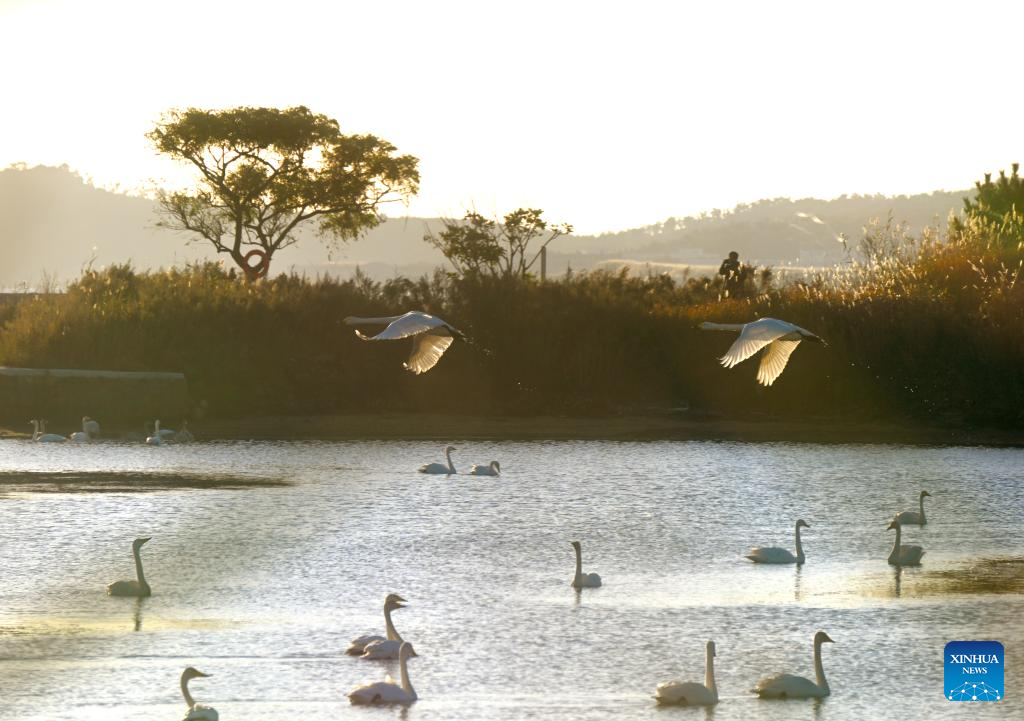 Swans are pictured at a reserve in Rongcheng, east China's Shandong Province, Oct. 28, 2024. (Photo by Yang Zhili/Xinhua)
