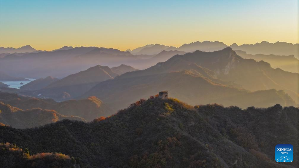 An aerial drone photo taken on Oct. 27, 2024 shows the autumn scenery around a section of the Great Wall at Wangzhai Township in Zunhua City, north China's Hebei Province. (Photo by Liu Mancang/Xinhua)