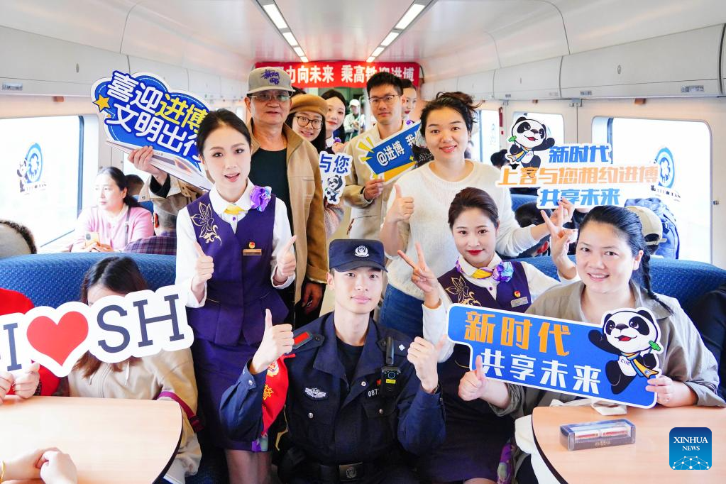 Passengers and crew members pose for a group photo during a promotion event for the seventh China International Import Expo (CIIE) on the train D3205 on Oct. 28, 2024. The CIIE is scheduled to take place in Shanghai from Nov. 5 to 10. (Photo by Xie Xin/Xinhua)