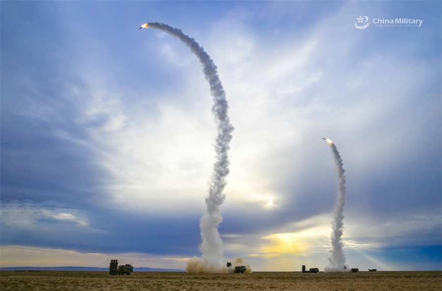 Air-defense missile systems attached to a brigade under the Chinese PLA 74th Group Army fire missiles at simulated air targets during a round-the-clock live-fire training exercise on August 6, 2024. (eng.chinamil.com.cn/Photo by Yu Xiao)