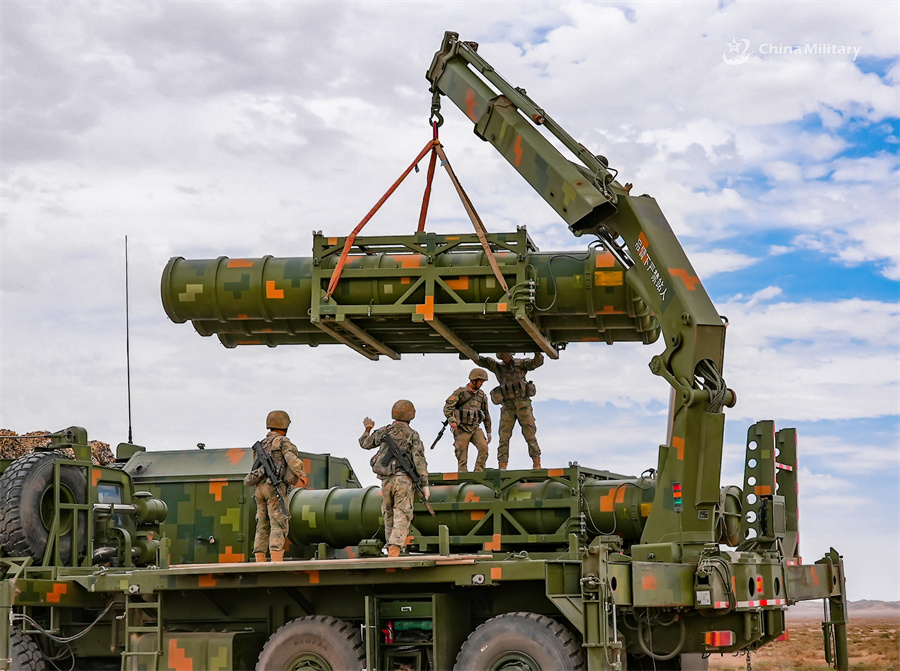 Soldiers assigned to a brigade under the Chinese PLA 74th Group Army hoist and load air-defense missile systems onto a missile launching truck during a round-the-clock live-fire training exercise on August 6, 2024. (eng.chinamil.com.cn/Photo by Yu Xiao)