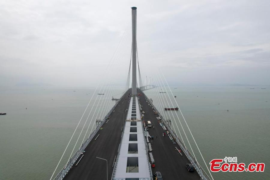 Asphalt pavement on the cross-sea link, which is another artery in the Guangdong-Hong Kong-Macao Greater Bay Area after the Hong Kong-Zhuhai-Macao Bridge and Shenzhen-Zhongshan link, was completed Tuesday.