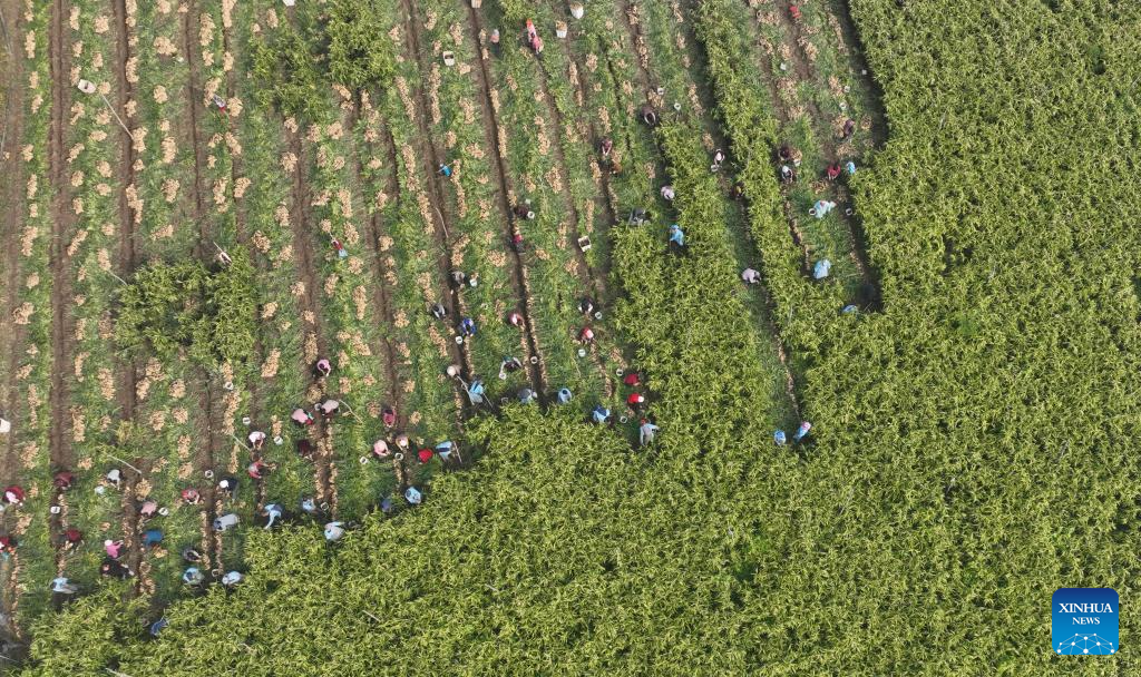 An aerial drone photo taken on Oct. 30, 2024 shows farmers harvesting rehmannia, a kind of herbal medicine, in Yuanshi County, north China's Hebei Province. (Photo by Zhang Xiaofeng/Xinhua)