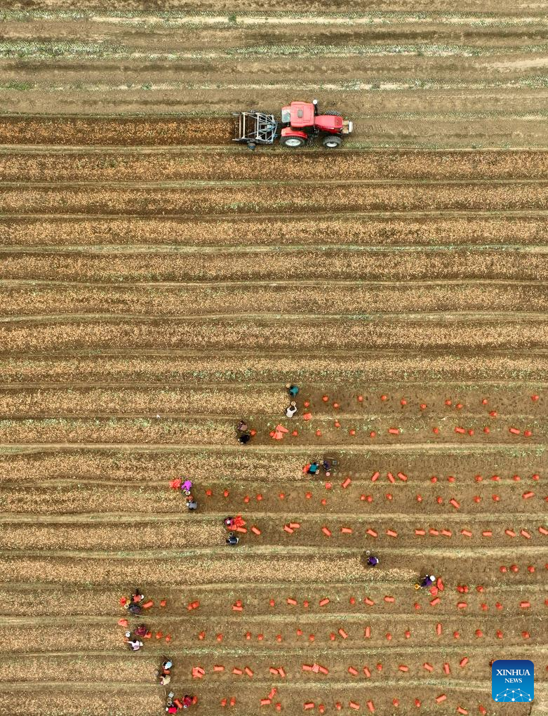 An aerial drone photo taken on Oct. 30, 2024 shows farmers harvesting fresh ginger in Zhongjia Village, Zouping City of east China's Shandong Province. (Photo by Dong Naide/Xinhua)