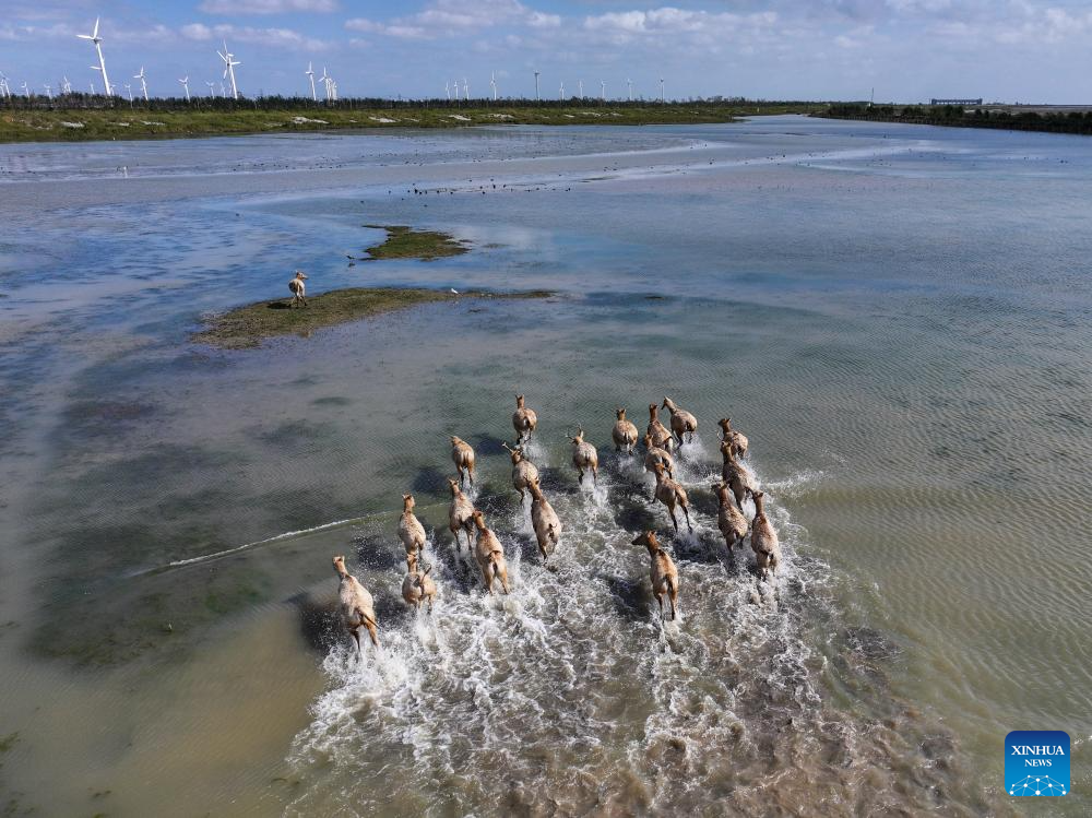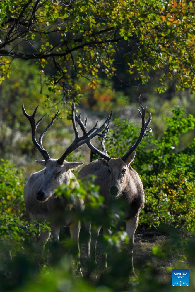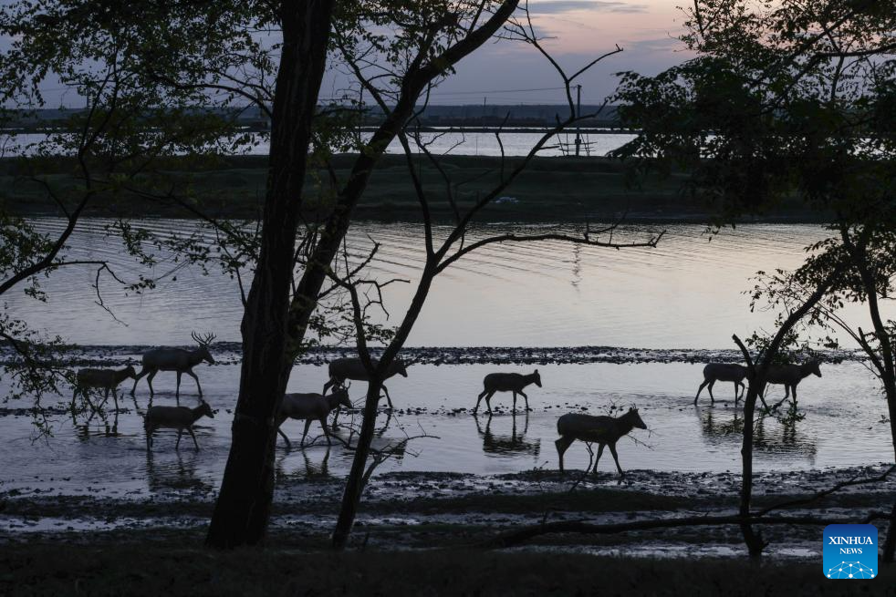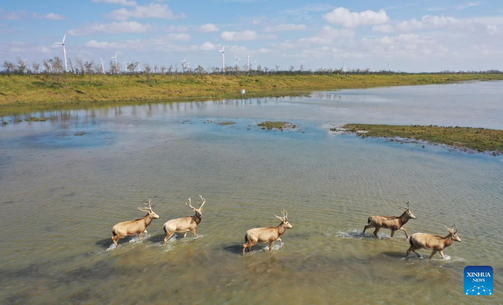 Milu deer are seen in Dafeng Milu National Nature Reserve in east China's Jiangsu Province, Oct. 28, 2024. Thanks to reinforced efforts in ecological protection and animal preservation, the Dafeng Milu National Nature Reserve has welcomed 825 newborns of milu deer, a species endemic to China, so far this year. The milu deer population here has exceeded 8,200, including some 3,500 living on their own in the wild. (Xinhua/Lyu Shuai)