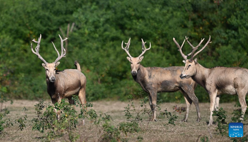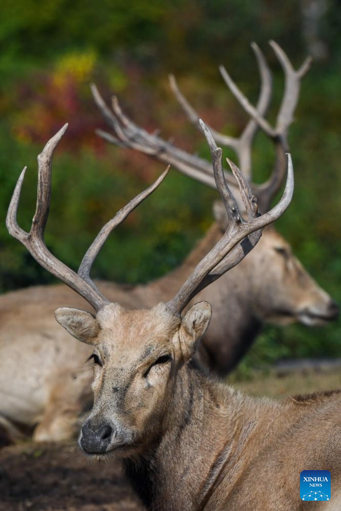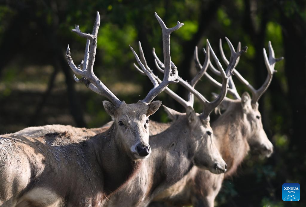 Milu deer are seen in Dafeng Milu National Nature Reserve in east China's Jiangsu Province, Oct. 28, 2024. Thanks to reinforced efforts in ecological protection and animal preservation, the Dafeng Milu National Nature Reserve has welcomed 825 newborns of milu deer, a species endemic to China, so far this year. The milu deer population here has exceeded 8,200, including some 3,500 living on their own in the wild. (Xinhua/Deng Hua)