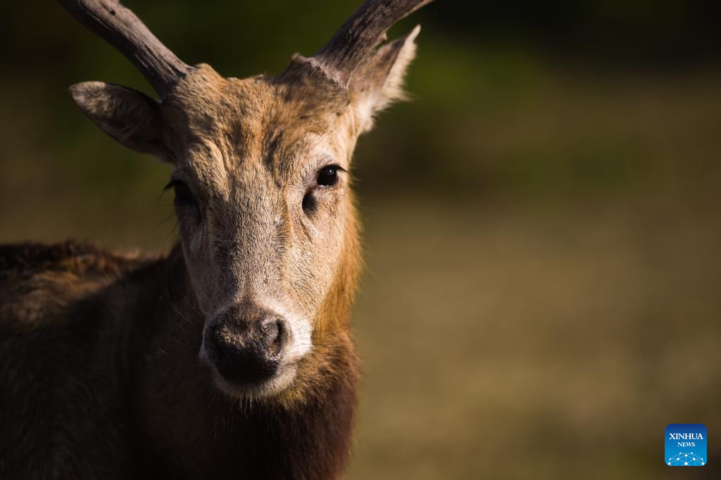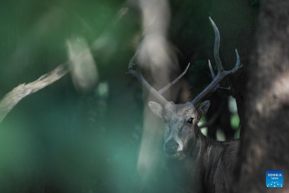 A milu deer is seen in Dafeng Milu National Nature Reserve in east China's Jiangsu Province, Oct. 28, 2024. Thanks to reinforced efforts in ecological protection and animal preservation, the Dafeng Milu National Nature Reserve has welcomed 825 newborns of milu deer, a species endemic to China, so far this year. The milu deer population here has exceeded 8,200, including some 3,500 living on their own in the wild. (Xinhua/Deng Hua)