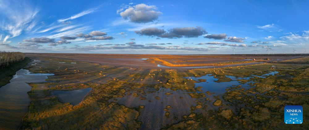 A drone photo shows milu deer in Dafeng Milu National Nature Reserve in east China's Jiangsu Province, Oct. 28, 2024. Thanks to reinforced efforts in ecological protection and animal preservation, the Dafeng Milu National Nature Reserve has welcomed 825 newborns of milu deer, a species endemic to China, so far this year. The milu deer population here has exceeded 8,200, including some 3,500 living on their own in the wild. (Xinhua/Lyu Shuai)