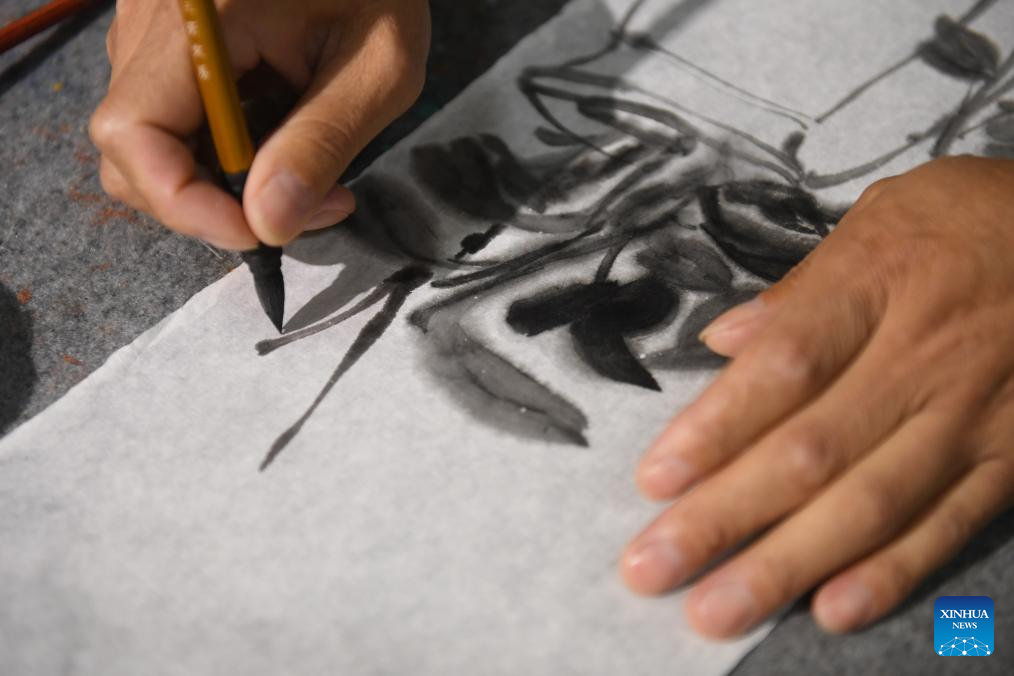 Huang Hongjian paints on a piece of paper he made at his studio in Kaihua county of Quzhou, east China's Zhejiang Province, Nov. 9, 2023. (Xinhua/Weng Xinyang)