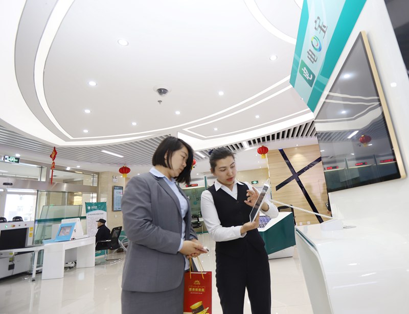 A staff member of the Urumqi branch of the State Grid Xinjiang Electric Power Co., Ltd. helps a customer handle access to electricity online in a service hall on Beijing Road, Urumqi, capital of northwest China's Xinjiang Uygur Autonomous Region, on Oct. 30, 2024. (Photo/Wang Jinkui)?