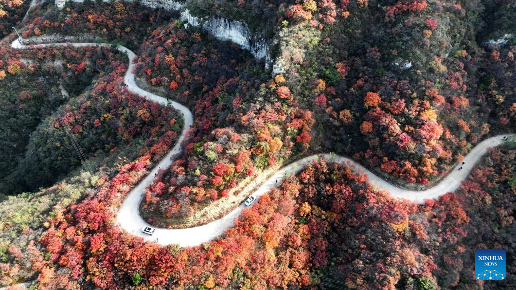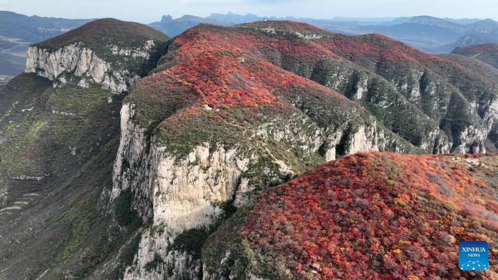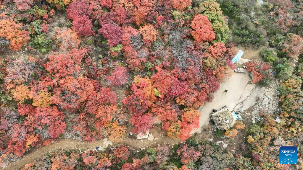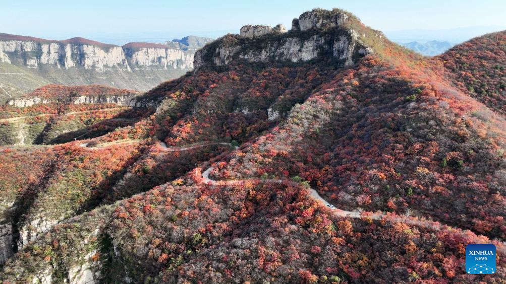 This aerial drone photo taken on Oct. 30, 2024 shows the autumn scenery of Jiguan Mountain scenic area in Shahe City, north China's Hebei Province. The Jiguan Mountain has entered its peak viewing season, drawing tourists to explore its beauty. (Xinhua/Mu Yu)