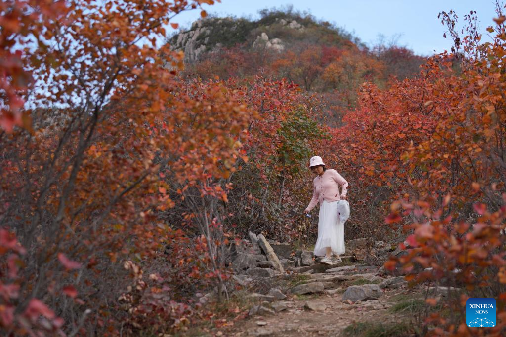 A tourist visits Jiguan Mountain scenic area in Shahe, north China's Hebei Province, Oct. 30, 2024. The Jiguan Mountain has entered its peak viewing season, drawing tourists to explore its beauty. (Xinhua/Mu Yu)