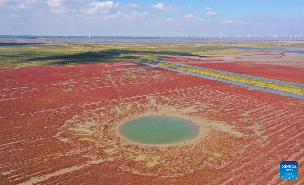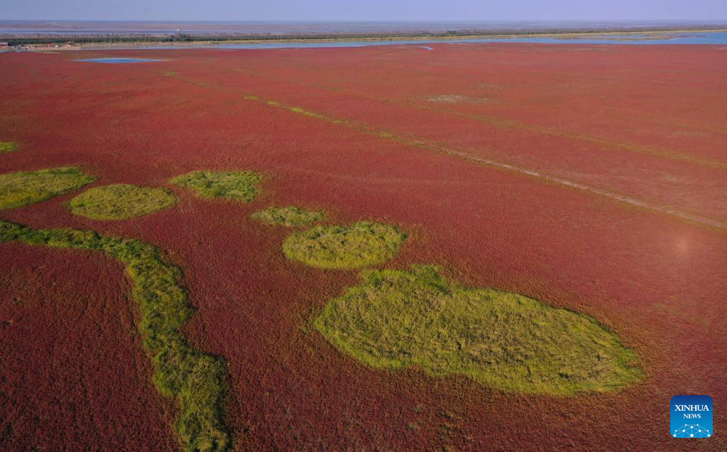 An aerial drone photo taken on Oct. 29, 2024 shows a view of the Tiaozini wetland in Dongtai of Yancheng City, east China's Jiangsu Province. (Xinhua/Deng Hua)