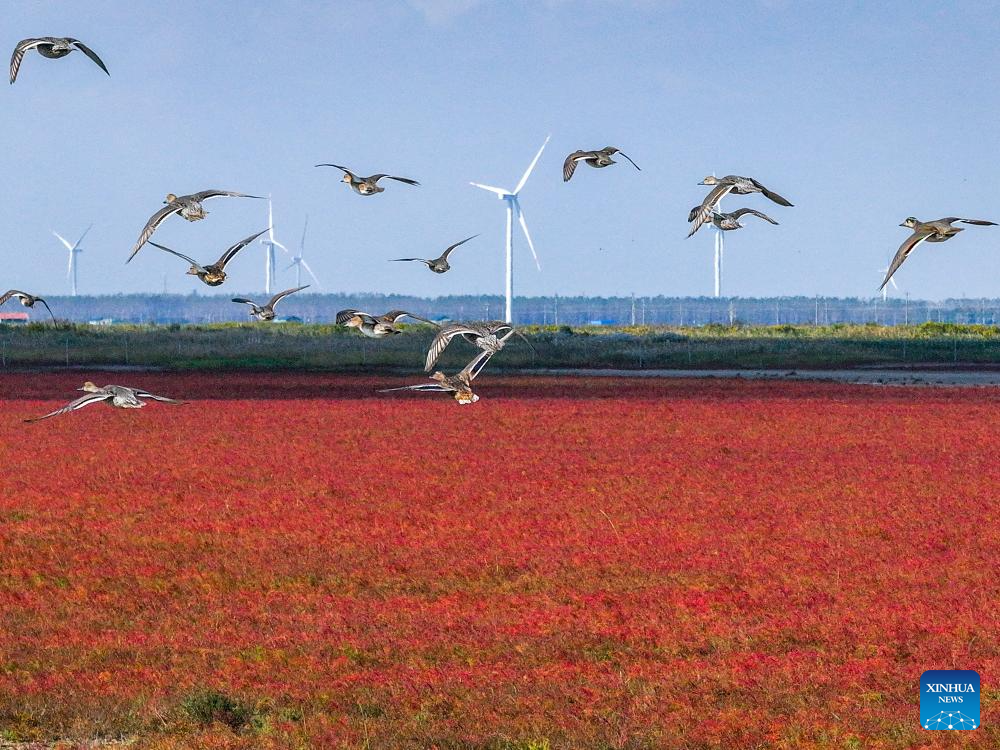 A drone photo show birds flying over the Tiaozini wetland in Dongtai of Yancheng City, east China's Jiangsu Province, Oct. 29, 2024. (Xinhua/Li Bo)