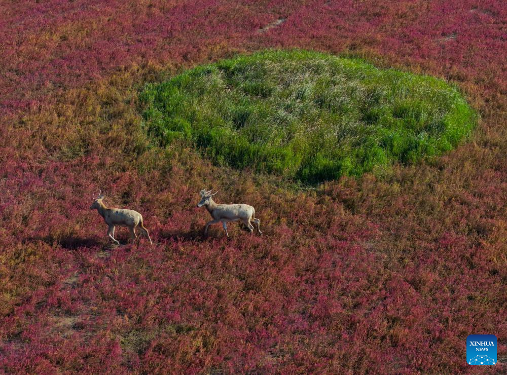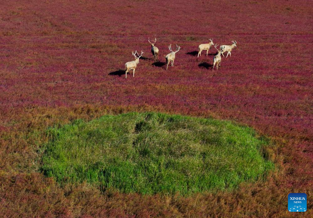 An aerial drone photo taken on Oct. 29, 2024 shows elks at Tiaozini wetland in Dongtai of Yancheng City, east China's Jiangsu Province. (Xinhua/Deng Hua)
