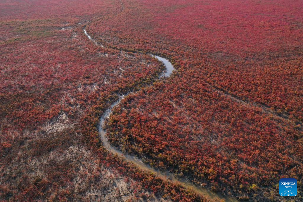 An aerial drone photo taken on Oct. 29, 2024 shows a view of the Tiaozini wetland in Dongtai of Yancheng City, east China's Jiangsu Province. (Xinhua/Li Bo)