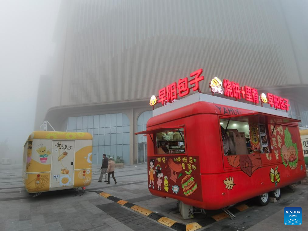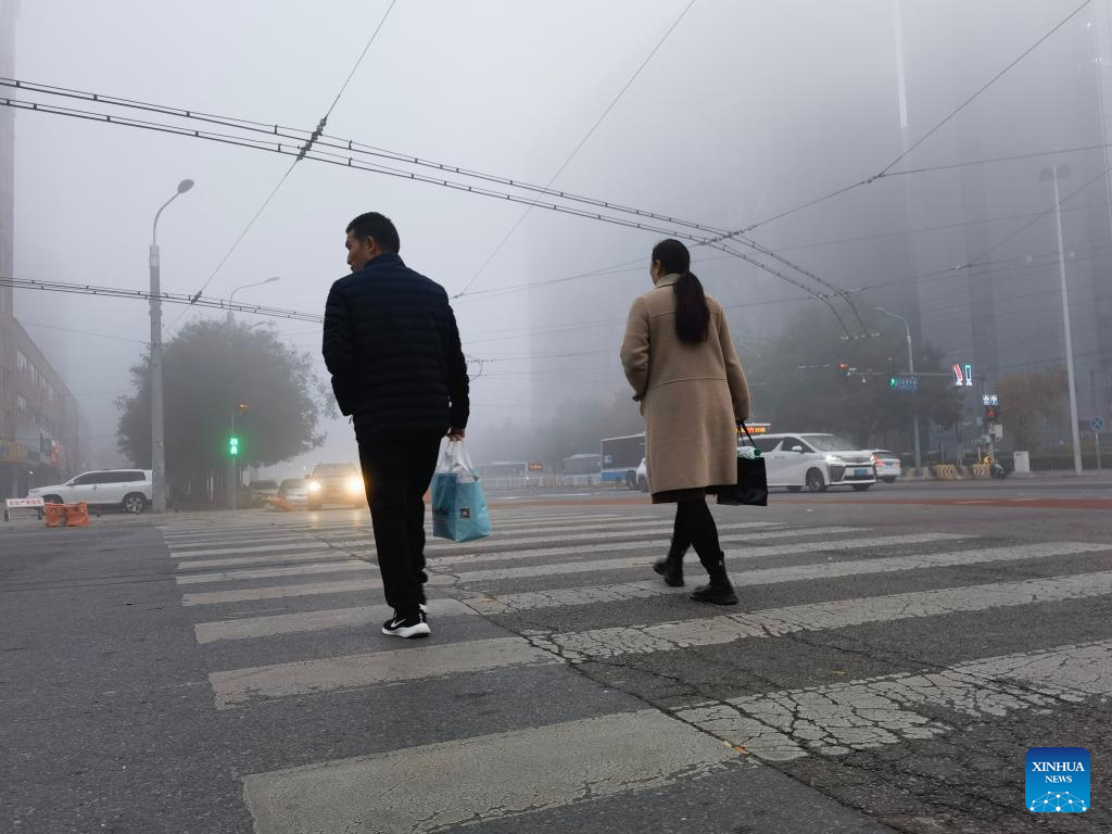 People walk on a street amid fog in Beijing, capital of China, Nov. 2, 2024. (Xinhua/Ren Zhenglai)