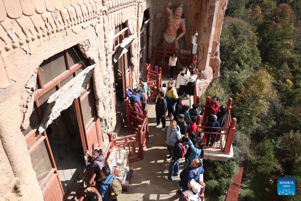 Tourists visit the Maiji Mountain Grottoes in Maiji District of Tianshui City, northwest China's Gansu Province on Nov. 2, 2024. The Maiji Mountain Grottoes is one of the four most famous grottoes in China. In the past three years, 29 caves here have been protected and reinforced as Maiji Mountain Grottoes art institute and other cultural relics protection organizations have employed scientific and technological methods to ensure the grottoes remain well-preserved. (Xinhua/Chen Bin)