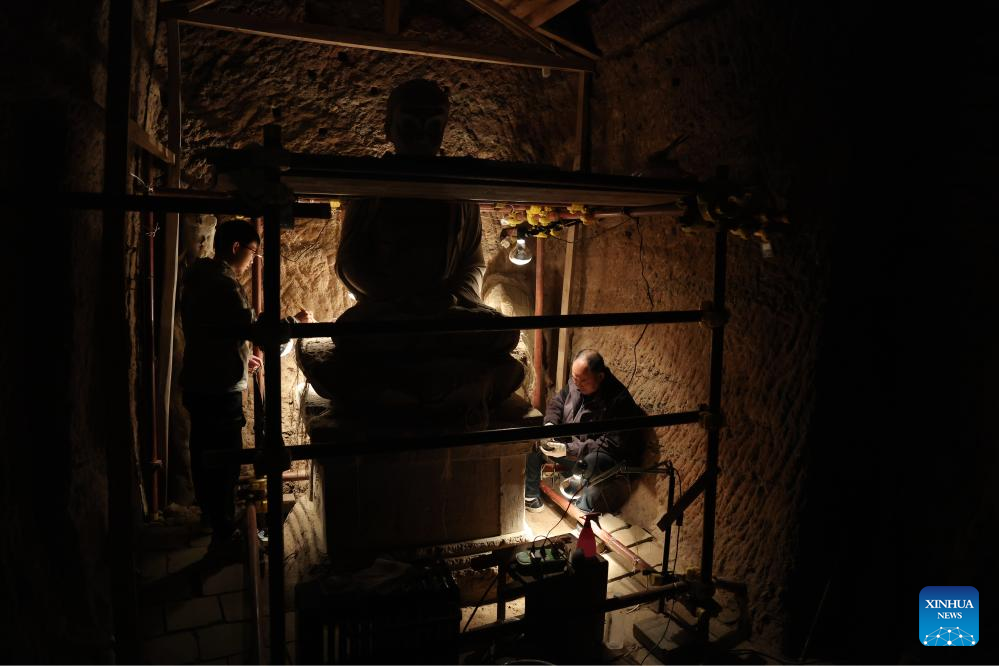 Mu Changyou, a cultural relics restorer of Maiji Mountain Grottoes art institute, checks a statue at a cave of the Maiji Mountain Grottoes in Maiji District of Tianshui City, northwest China's Gansu Province on Nov. 2, 2024. The Maiji Mountain Grottoes is one of the four most famous grottoes in China. In the past three years, 29 caves here have been protected and reinforced as Maiji Mountain Grottoes art institute and other cultural relics protection organizations have employed scientific and technological methods to ensure the grottoes remain well-preserved. (Xinhua/Chen Bin)