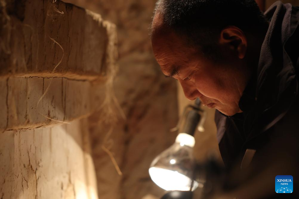 Mu Changyou, a cultural relics restorer of Maiji Mountain Grottoes art institute, carries out protection and restoration work at a cave of the Maiji Mountain Grottoes in Maiji District of Tianshui City, northwest China's Gansu Province on Nov. 2, 2024. The Maiji Mountain Grottoes is one of the four most famous grottoes in China. In the past three years, 29 caves here have been protected and reinforced as Maiji Mountain Grottoes art institute and other cultural relics protection organizations have employed scientific and technological methods to ensure the grottoes remain well-preserved. (Xinhua/Chen Bin)