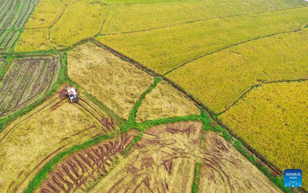 An aerial drone photo taken on Nov. 2, 2024 shows a harvester working in a paddy field in Jingtang Village in Zixing, central China's Hunan Province. (Photo by Li Ke/Xinhua)