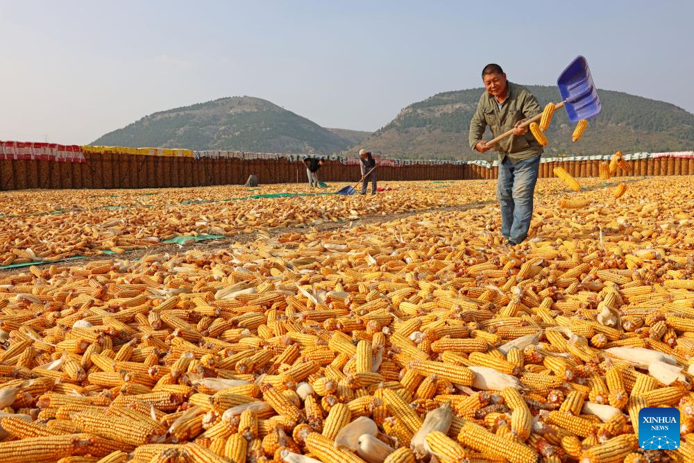 Farmers air corn in Zaozhuang City, east China's Shandong Province, Nov. 1, 2024. (Photo by Sun Zhongzhe/Xinhua)