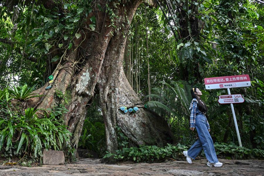 This photo taken on Nov. 1, 2024 shows a visitor walking past a tree at the Yanoda Rain Forest Cultural Tourism Zone in Baoting Li and Miao Autonomous County, south China's Hainan Province. (Xinhua/Pu Xiaoxu)