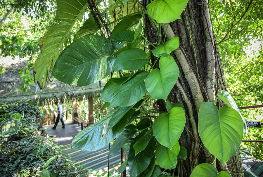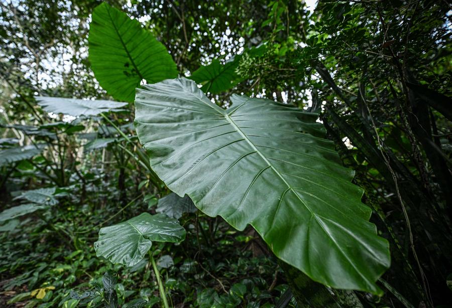 This photo taken on Nov. 1, 2024 shows a giant leaf at the Yanoda Rain Forest Cultural Tourism Zone in Baoting Li and Miao Autonomous County, south China's Hainan Province. (Xinhua/Pu Xiaoxu)