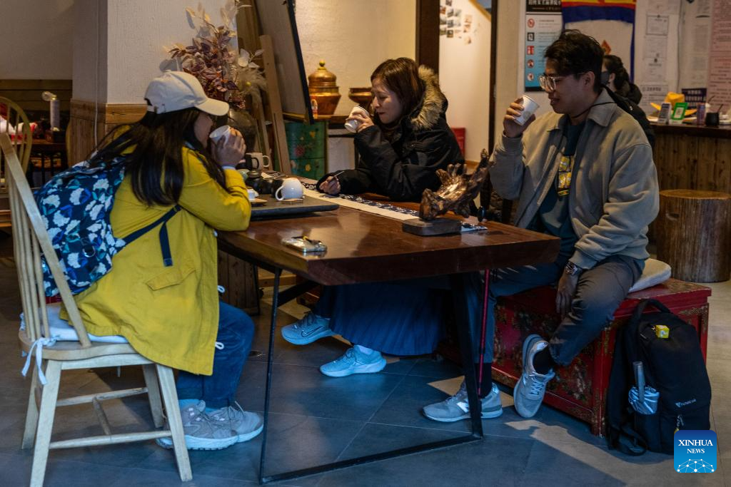 Tourists take a rest at a homestay at Yading scenic spot in Daocheng County of Tibetan Autonomous Prefecture of Garze, southwest China's Sichuan Province, Oct. 31, 2024. (Xinhua/Chu Jiayin)