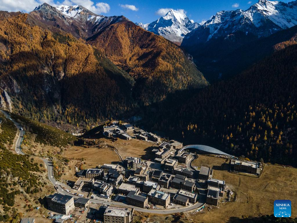 This aerial drone photo taken on Oct. 31, 2024 shows a view of the Yading Village in Yading scenic spot in Daocheng County of Tibetan Autonomous Prefecture of Garze, southwest China's Sichuan Province. (Xinhua/Chu Jiayin)