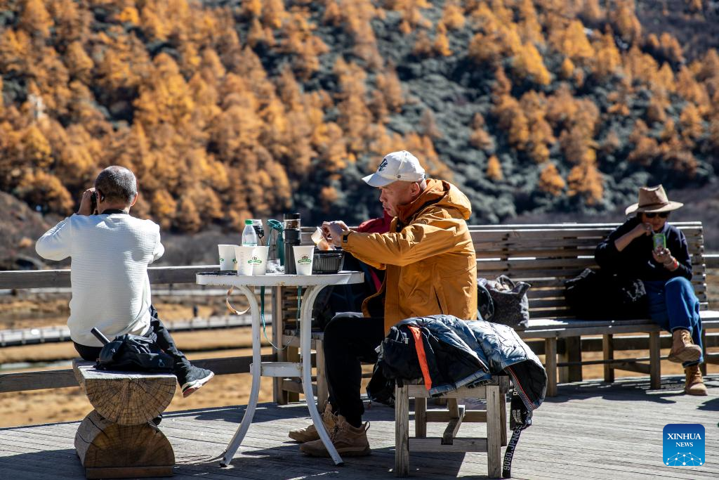Tourists take a rest at a service station of Yading scenic spot in Daocheng County of Tibetan Autonomous Prefecture of Garze, southwest China's Sichuan Province, Oct. 31, 2024. (Xinhua/Chu Jiayin)