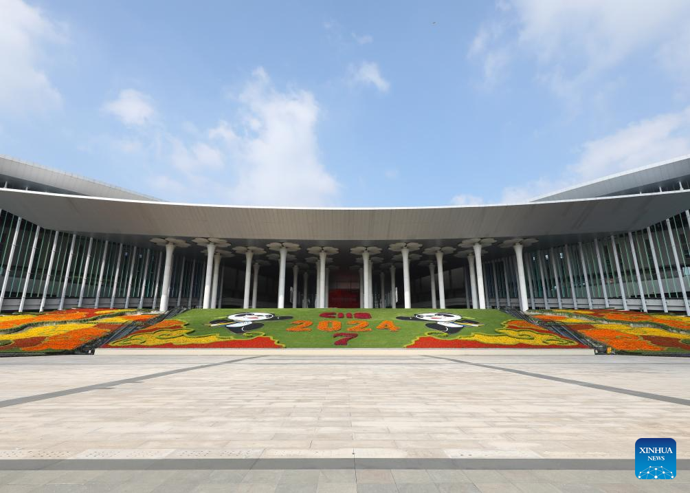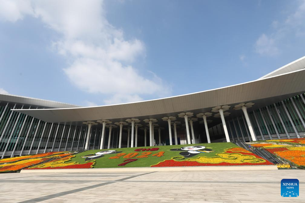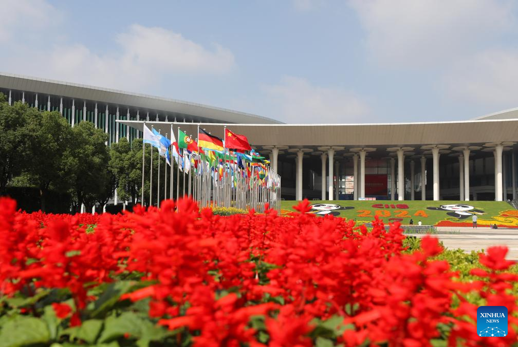 This photo taken on Nov. 2, 2024 shows the south square of the National Exhibition and Convention Center (Shanghai), the main venue for the 7th China International Import Expo (CIIE), in east China's Shanghai. Preparations for the 7th CIIE, which is scheduled to take place in Shanghai from Nov. 5 to 10, have entered the final stage. (Xinhua/Fang Zhe)